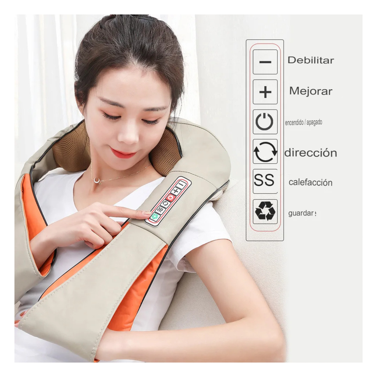 Relaja tu cuerpo donde y cuando quieras con el MASAJE PRO™, el masajeador eléctrico ideal para cuello, hombros y espalda. Equipado con calor infrarrojo, rodillos shiatsu 3D y materiales de alta calidad, transforma cualquier lugar en tu centro de bienestar personal.